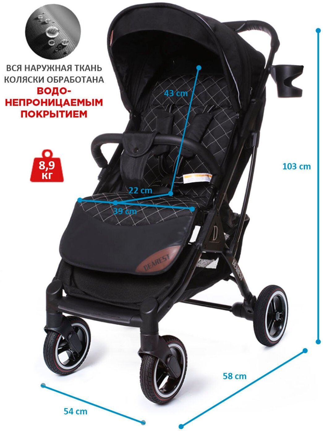 Коляска прогулочная Dearest 819 PLUS модель 2023, с механической спинкой, большим капюшоном, накидкой для ног, полная комплектация, черная рама (черный) информация: