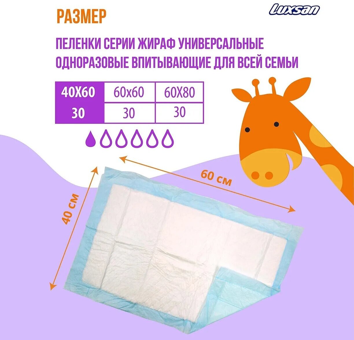 Пеленки впитывающие Luxsan универсальные серия "Жираф" 40х60, 30шт информация: