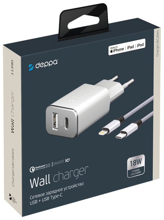 Сетевое зарядное устройство Deppa USB-C+USB-A, PD 3.0,каб.USB-C-Lightning MFI белый информация: