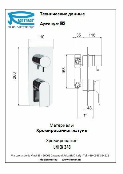 Смеситель Remer Infinity I93 для душа/ванны, хром информация: