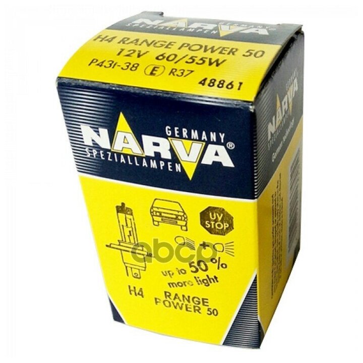 Лампа автомобильная галогенная Narva Range Power +50% 48861 H4 12V 60/55W P43t-38 1 шт.