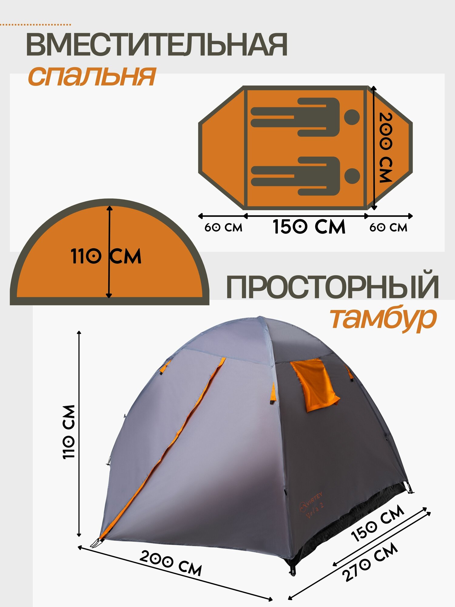 Палатка 2-местная Virtey Vela-2 /(60+150+60)*210*110/Палатка туристическая 2 местная двухслойная с 2 входами/тент для рыбалки/шатер для похода