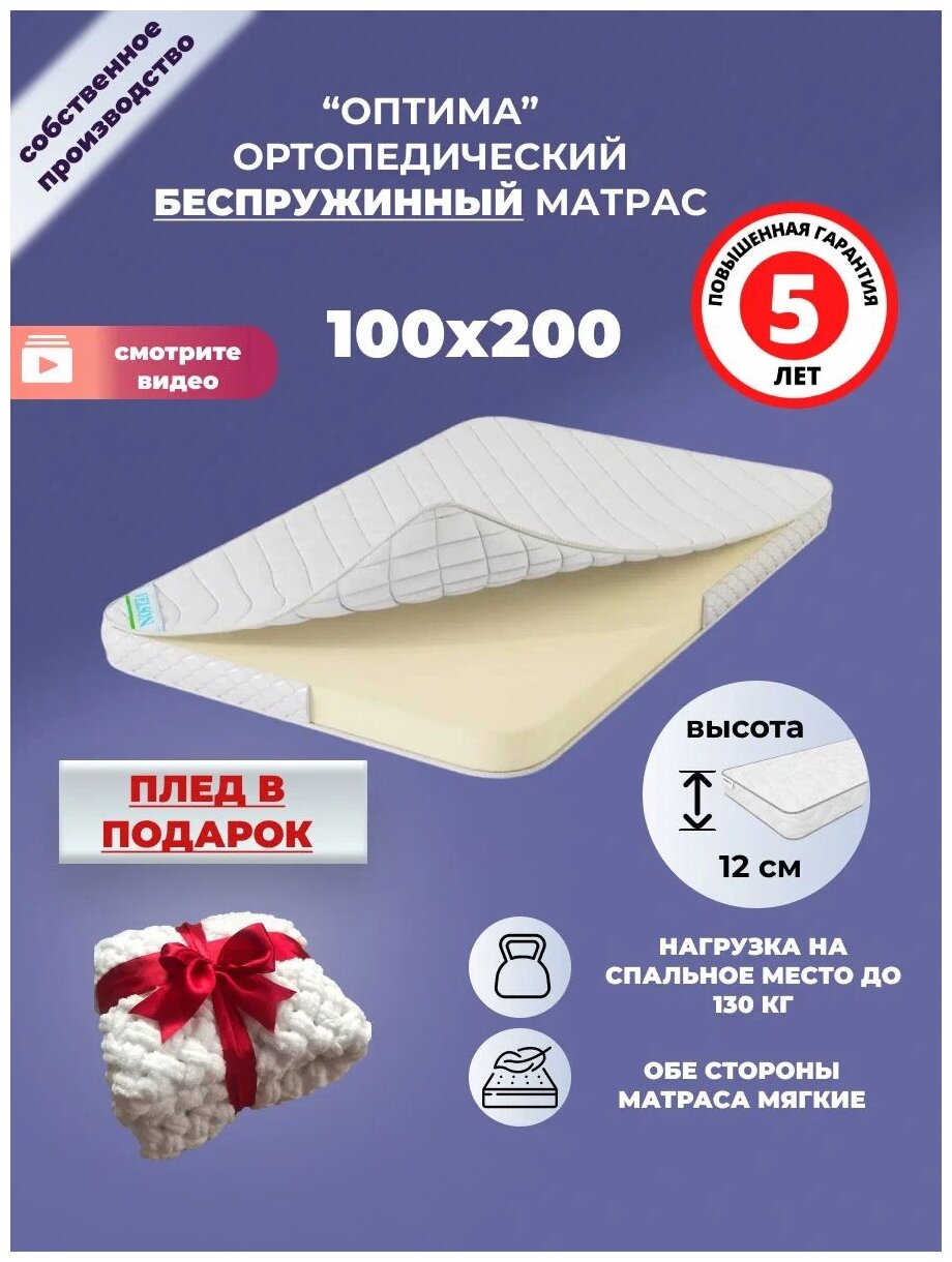Матрас 100х200 см, ОптиМа, Беспружинный, высота 12 см, Съемный чехол, Плед в подарок 8 316 ₽