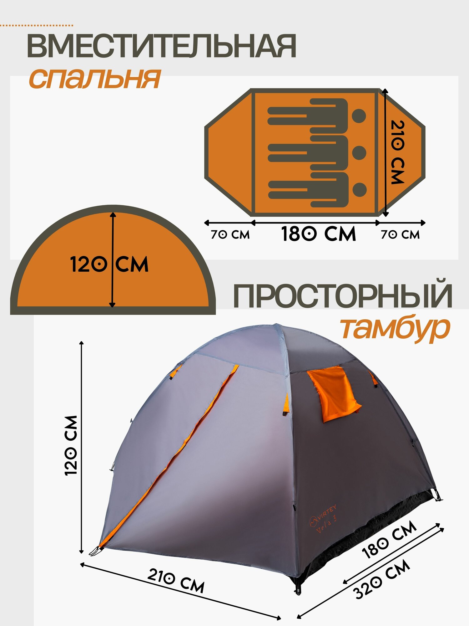 Палатка туристическая 3х местная двухслойная с 2 входами Virtey Vela-3 (320х210х120 см) информация: