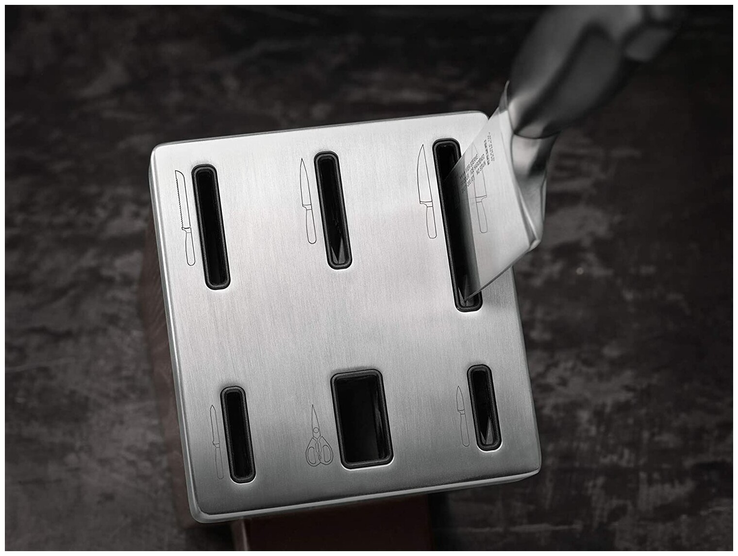 | Комплектация | овощной нож и нож для гарнира (10 см), универсальный нож (13 см), разделочный нож (20 см), поварской нож (20 см), нож для хлеба (20 см), универсальные ножницы (21 см), самообслуживания. -блок для заточки ножей белый |