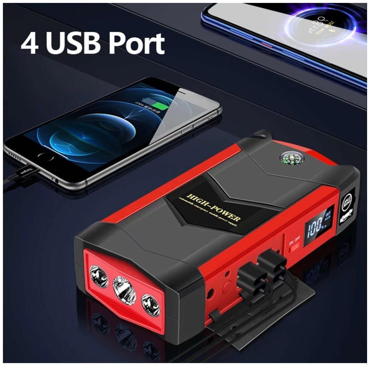 Пусковое устройство для авто, LED фонарь, черный матовый, 800 А, 18 см