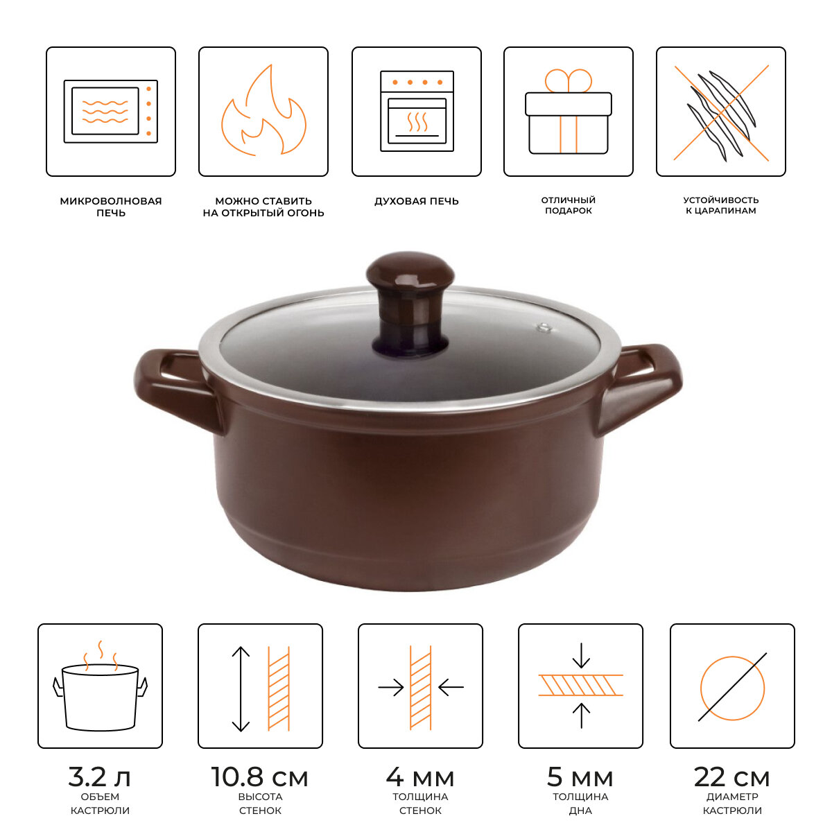 Отзывы на Кастрюля керамическая со стеклянной крышкой Ceraflame Duo 22 см, 3.2 л, шоколад