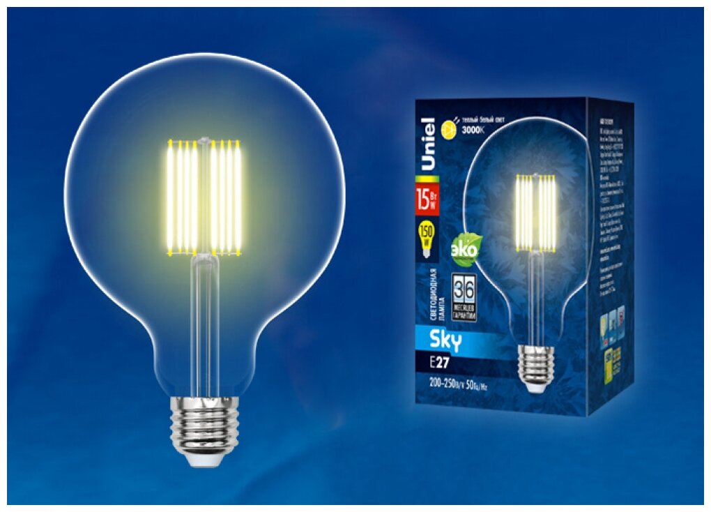Отзывы на Типы/Лампочки/Филаментные Uniel Лампа светодиодная филаментная Uniel E27 15W 3000K прозрачная LED-G125-15W/3000K/E27/CL PLS02WH UL-00004860