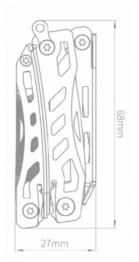 | Инструменты (функции) подробно | Плоскогубцы, нож, плоская и крестообразная отвертка, открывалка для бутылок, консервный нож, кусачки для проволоки, захват для мелких деталей, надфиль, универсальный нож |