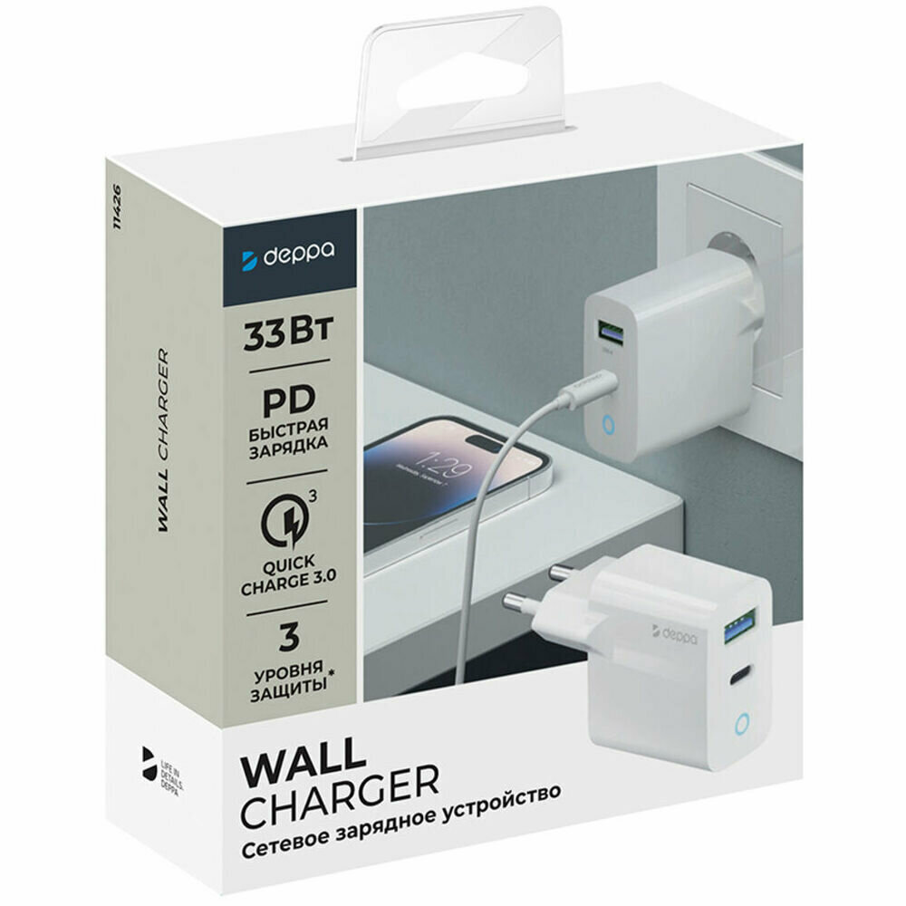 Сетевое зарядное устройство Deppa Power Delivery QC 3.0 33W USB A + Type-C белое (11426) информация: