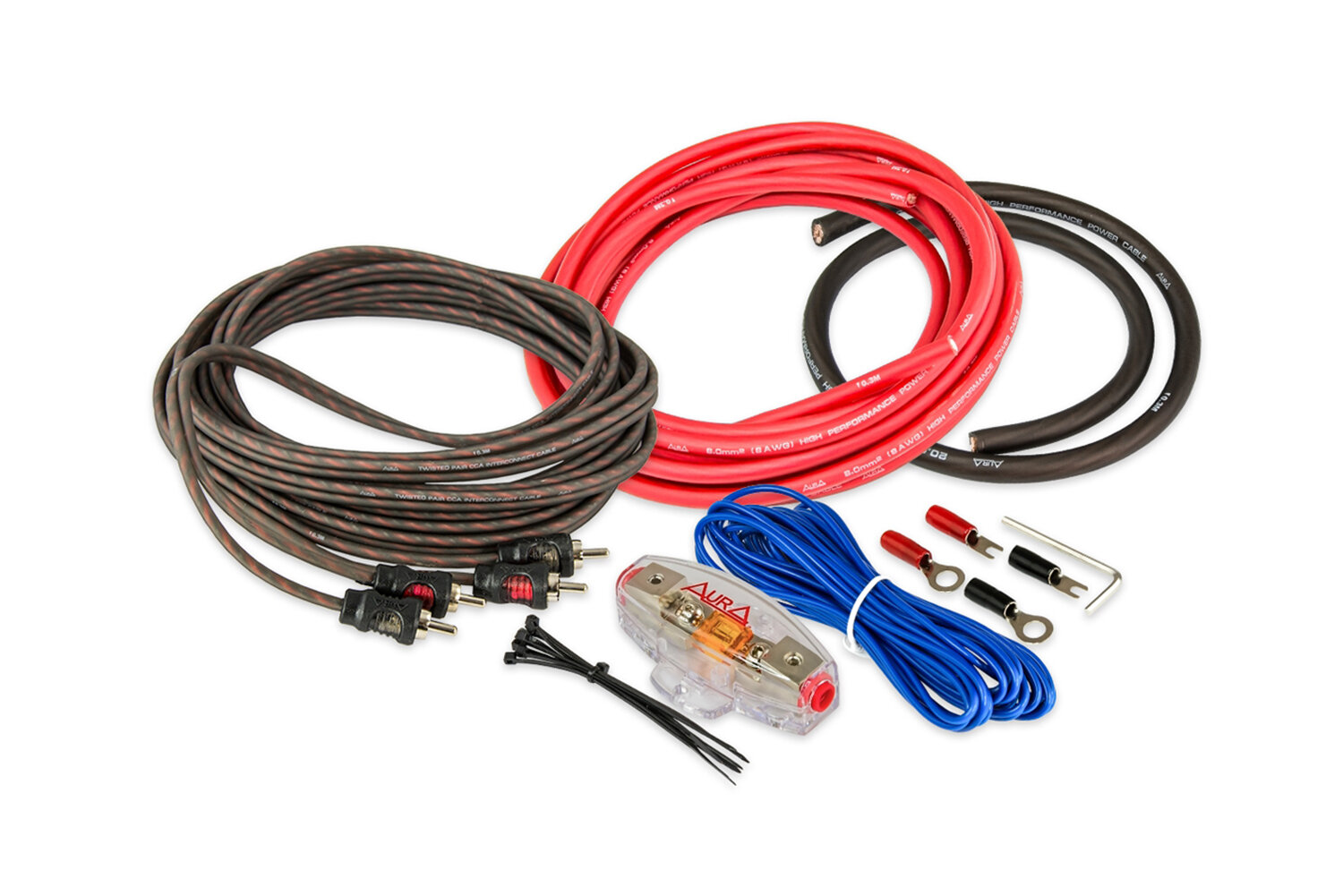 | Комплектация | Комплект для подключения 2-х канального усилителя. Силовой кабель 8AWG (8мм2) красный — 5 метров. Силовой кабель 8AWG (8мм2) черный — 1 метр. Держатель MiniANL + предохранитель 40A. RCA-кабель: 5 метров, 2 канала, витая пара (RCA-0250). Провод «remote» 18AWG (0,75мм2) синий — 5 метров. Клемма кольцевая для силового кабеля сечением 8AWG (8мм2): 2 шт. Клемма U-образная для силового кабеля сечением 8AWG (8мм2): 2 шт. Шестигранник. Стяжки — 10шт. |