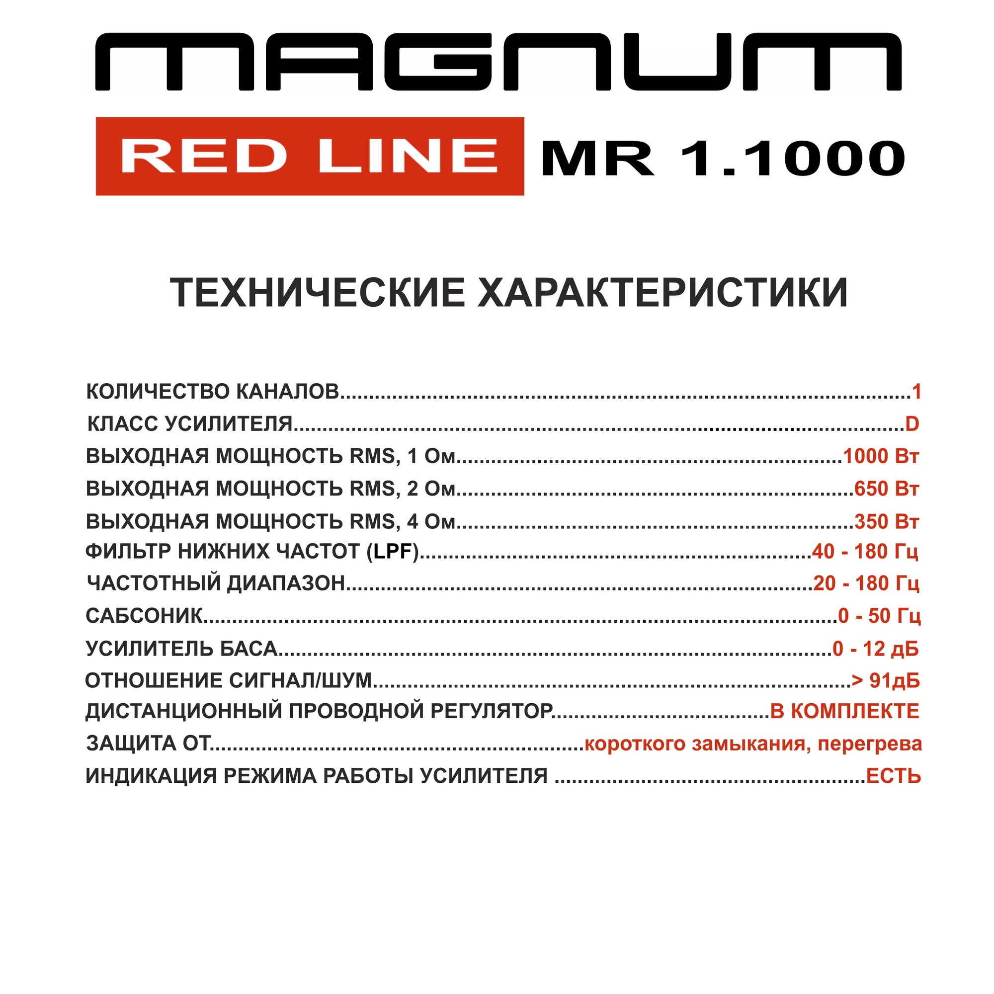 Автомобильный усилитель 1 канал 1000w MAGNUM RED LINE MR 1.1000 информация:
