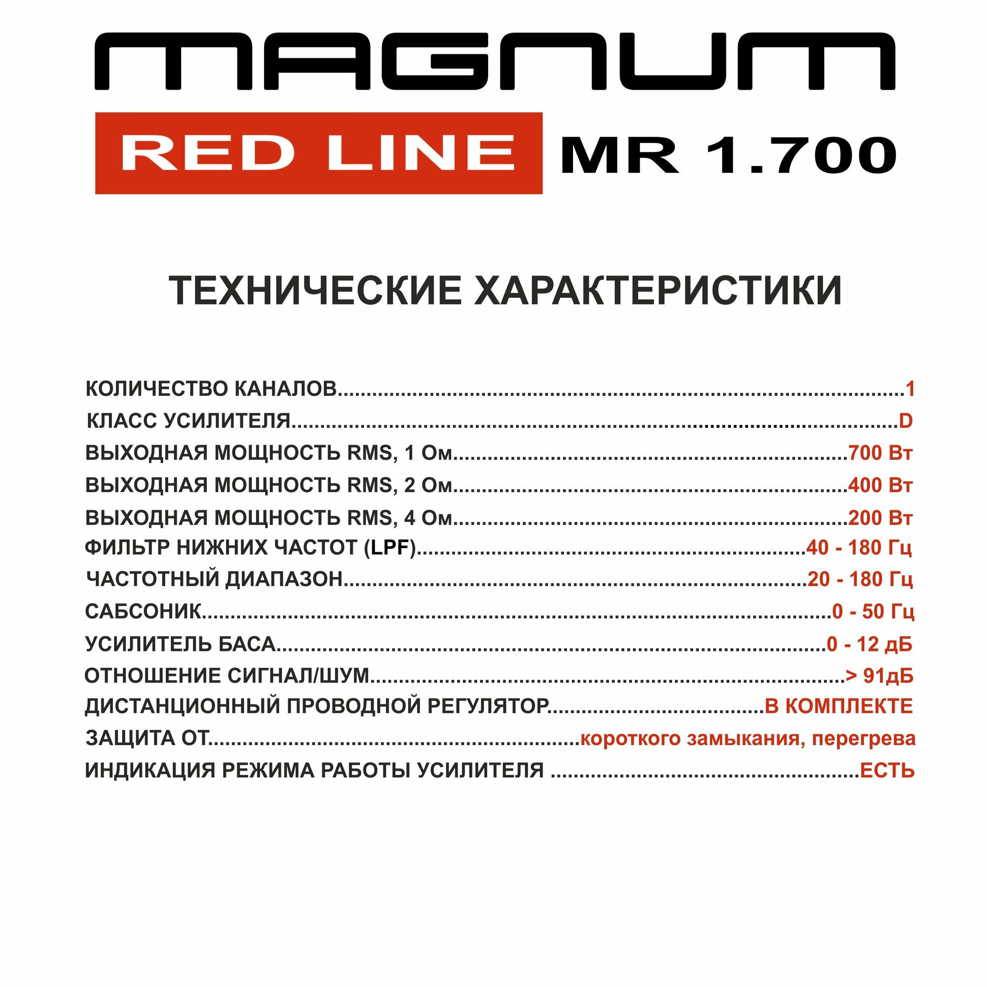 Автомобильный усилитель 1 канал 700w MAGNUM RED LINE MR 1.700 информация: