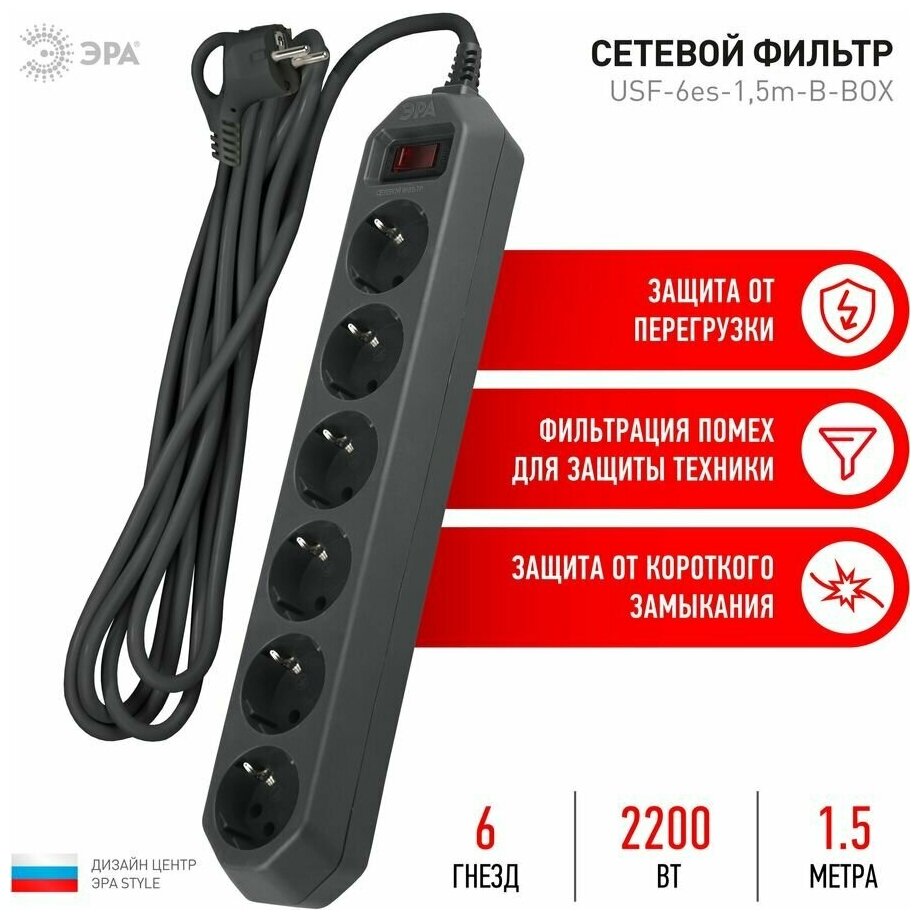 Сетевой фильтр Эра USF-6es-1,5m-B-BOX, 1.5м, черный [б0037261] информация: