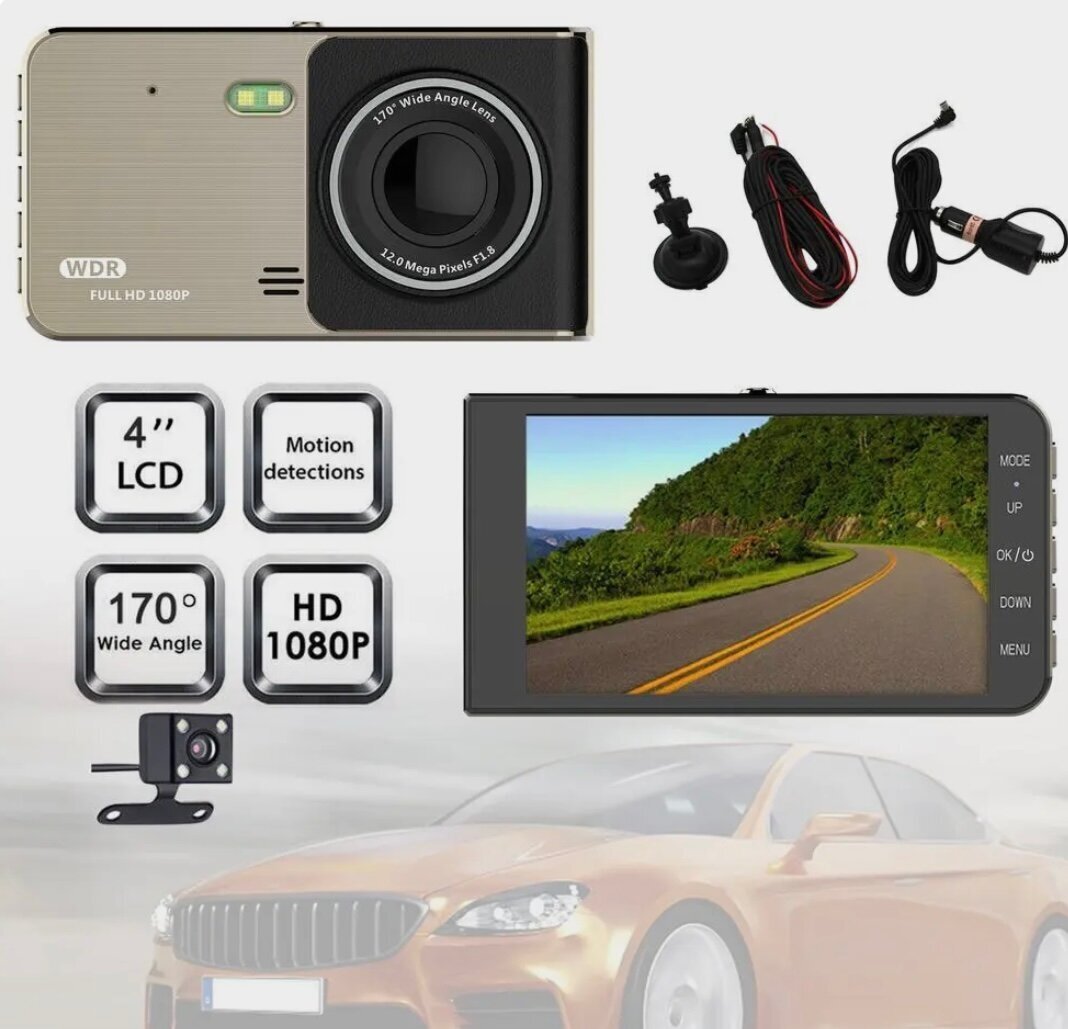 Автомобильный видеорегистратор, с камерой заднего вида, 2 камеры, 1920x1080