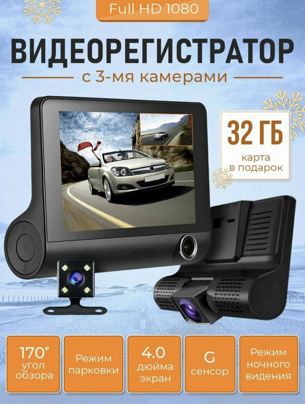Отзывы на DVR Автомобильный видеорегистратор с камерой заднего вида / Регистратор для авто 3 в 1 + карта памяти на 32 Гб