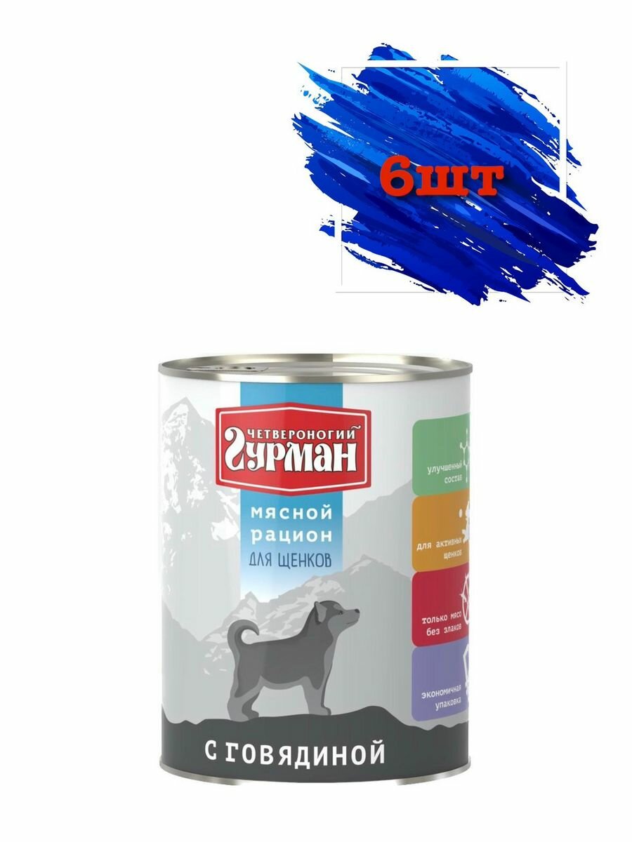 Корм Четвероногий гурман Мясной рацион (консерв.) для щенков, с говядиной, 850 г x 6 шт