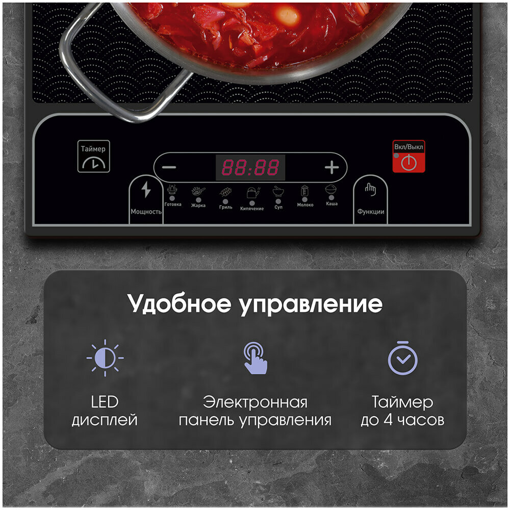 | Дополнительная информация | Автоматическое определение диаметра посуды: 12-26 см; максимальная допустимая нагрузка - 20 кг; программы: готовка, жарка, гриль, кипячение, суп, молоко, каша; напряжение 220-240 В; комплектация: плитка, инструкция, гарантийный талон; длина сетевого шнура 1.5 м |