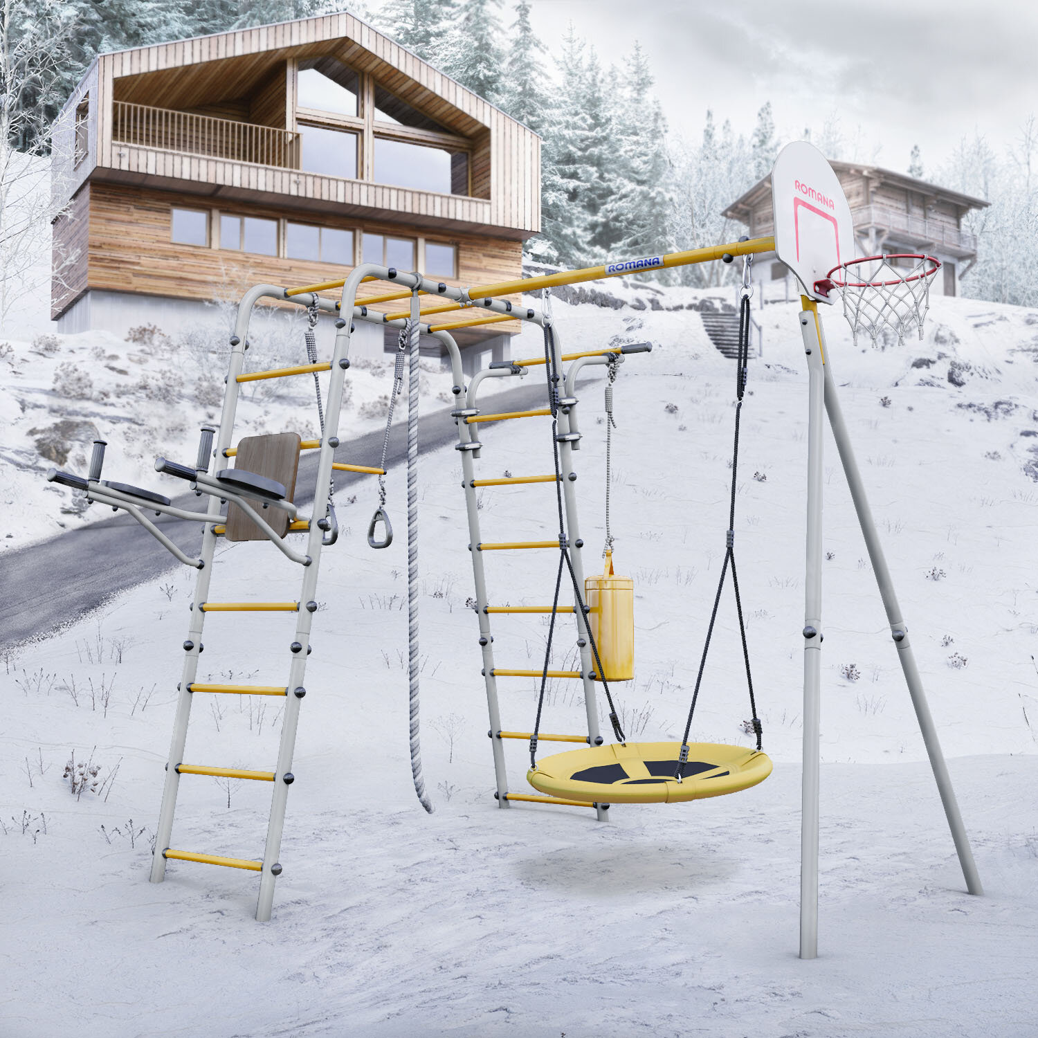 | В комплекте | баскетбольное кольцо, боксерская груша, канат, качели, лестница, рукоход, трапеция с кольцами, турник |