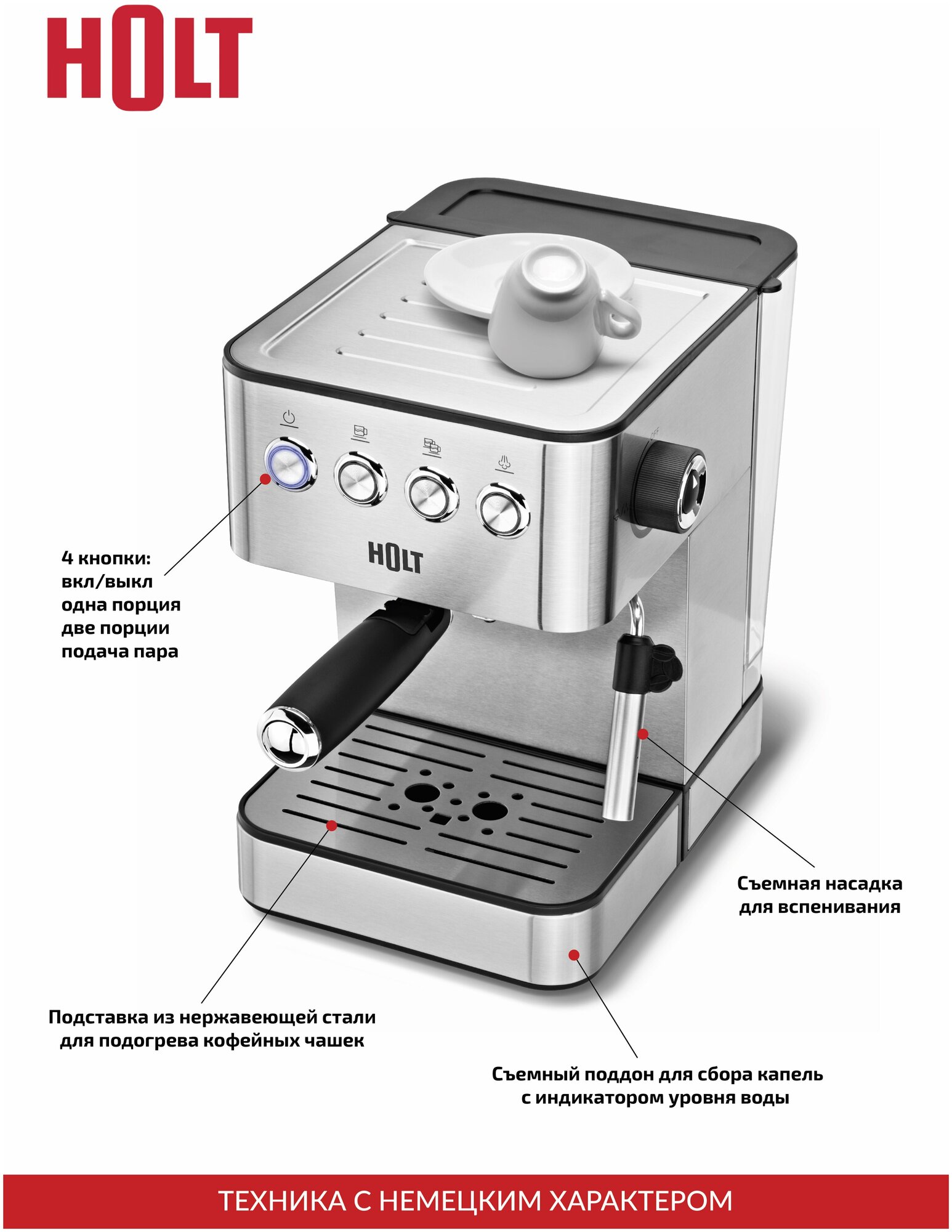 Кофемашина (кофеварка) рожковая (электрическая) для кухни Holt HT-СM-008 информация: