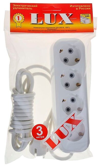 Удлинитель LUX У4-Е03 4гн с заз,250В 3м информация: