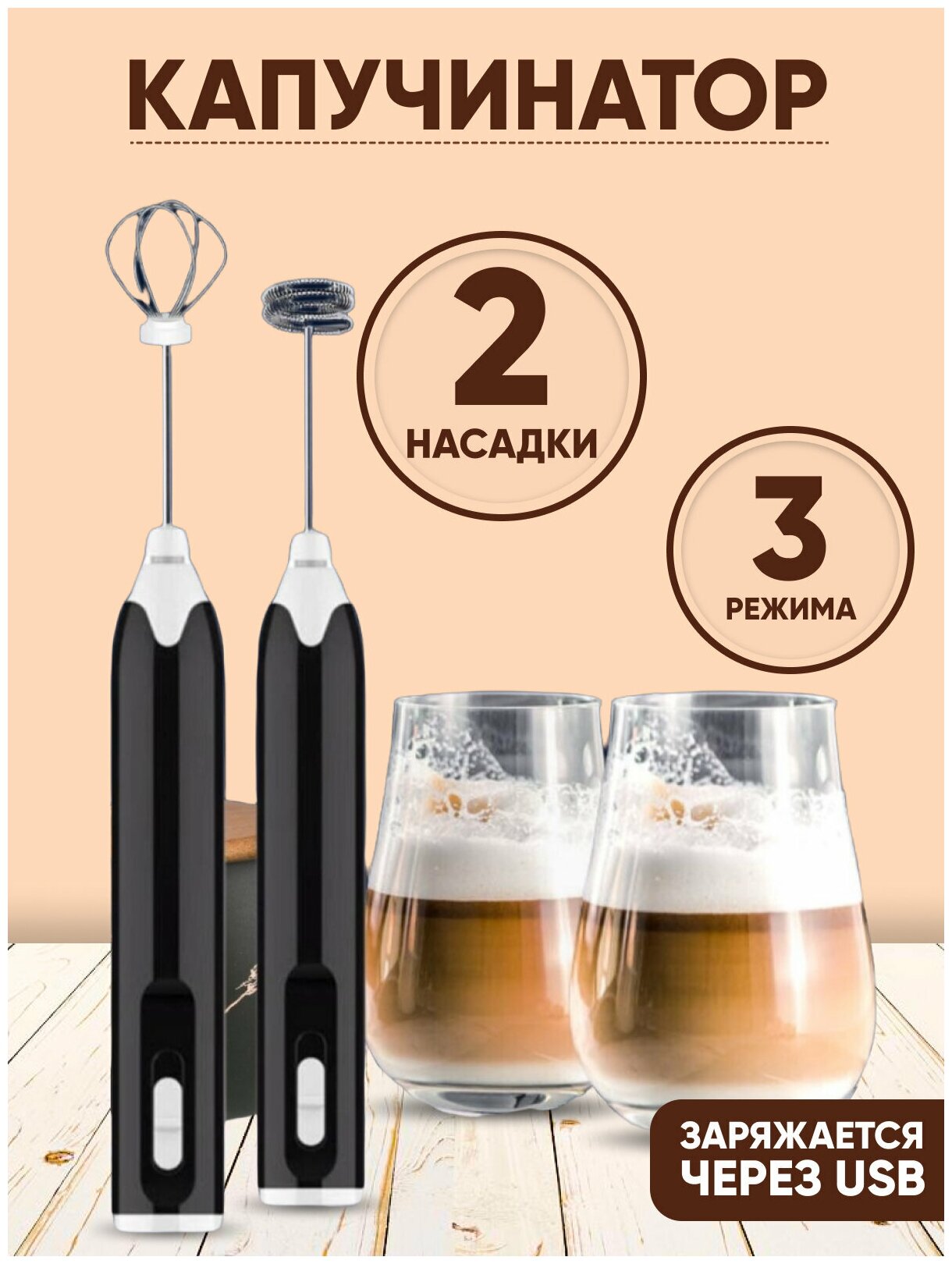 10 цен на Капучинатор / Зарядка через USB, в комплекте 2 насадки