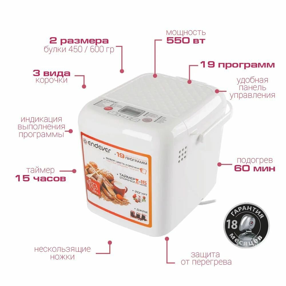 Хлебопечка с замесом теста Endever MB-64 / 20 автоматических программ / выпечка 750/1000/1250/грамм