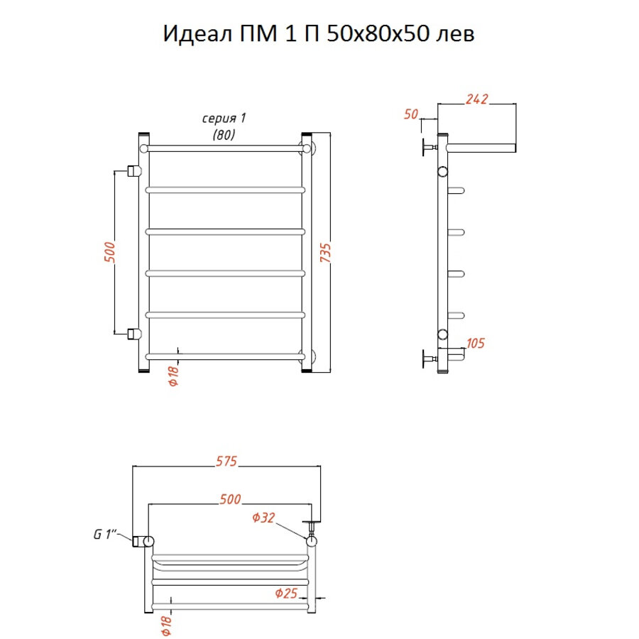 Полотенцесушитель Идеал ПМ 1 П 50*80*50 (ЛЦ5) лев информация: