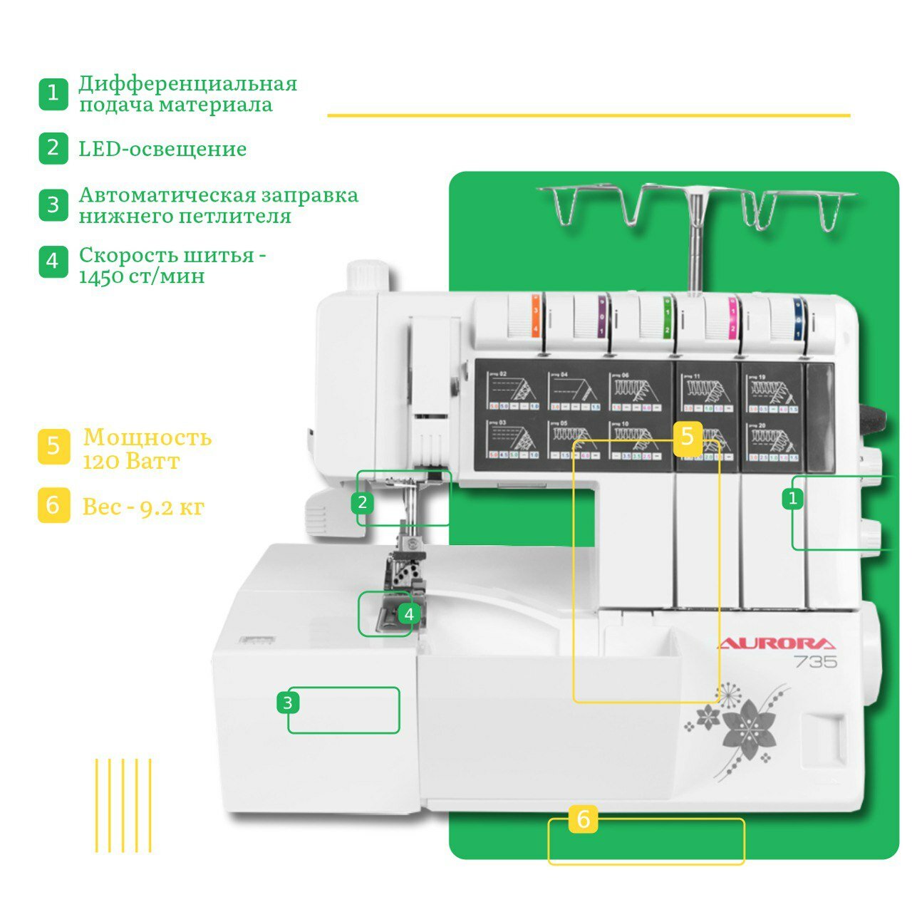 Коверлок Aurora 735 / для всех типов тканей / 2,3,4,5 ниточный / LED подстветка / помощник заправщика нижнего петлителя информация: