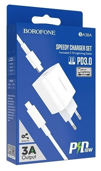 Сетевое зарядное устройство (СЗУ) Borofone BA38A Plus QC 3.0 (Type-C PD) + кабель Lightning, 3 А, белый