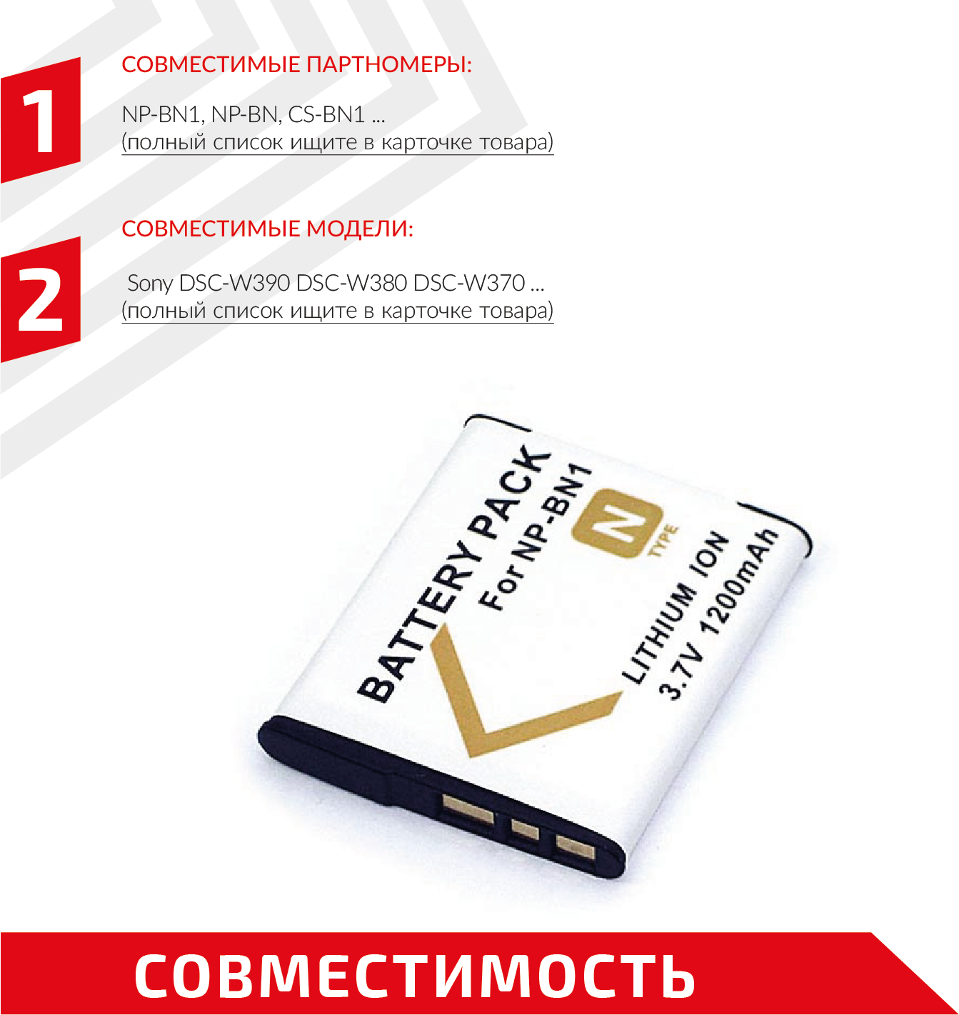 | Совместимость | Sony Cyber-shot DSC-J, QX, T, TF, TX, WX серии, Sony: DSC-WX1, DSC-TX5, DSC-TX5B, DSC-TX5G, DSC-TX5P, DSC-TX5R, DSC-TX5S, DSC-TX7, DSC-TX7C, DSC-TX7L, DSC-TX7R, DSC-TX7S, DSC-W310, DSC-W310B, DSC-W310P, DSC-W310S, DSC-W320, DSC-W320B, DSC-W320P, DSC-W320S, DSC-W320R, DSC-W330, DSC-W330B, DSC-W330L, DSC-W330R, DSC-W330S, DSC-W350, DSC-W350D, DSC-W350B, DSC-W350L, DSC-W350P, DSC-W350S, DSC-W360, DSC-W360B, DSC-W380, DSC-W380B, DSC-W380G, DSC-W380R, DSC-W380S, DSC-W390, DSC-W390B, DSC-W390S, DSC-T99DC, DSC-T99C, DSC-TX9C, DSC-WX5C, DSC-WX7, DSC-WX9, DES-WX10 |