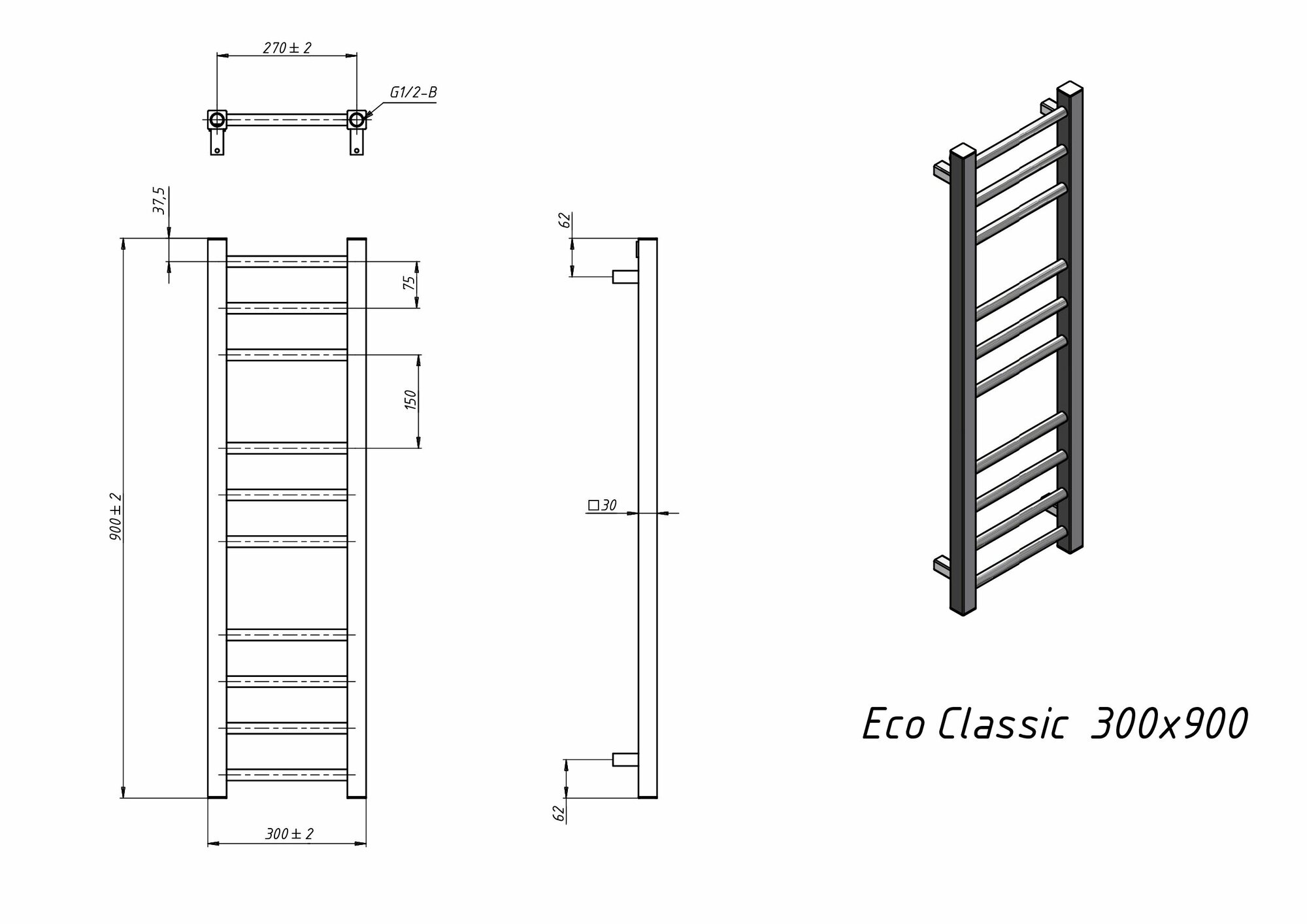 Электрический полотенцесушитель Grota Eco Classic 300x900 с терморегулятором 300W информация: