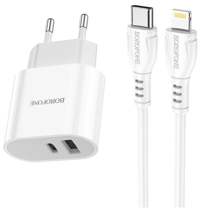 Сетевое зарядное устройство BOROFONE BA62A Wiseacre 1xUSB + USB-C + кабель USB-C Lightning 8 pin, 1м, 2,4A (белый)
