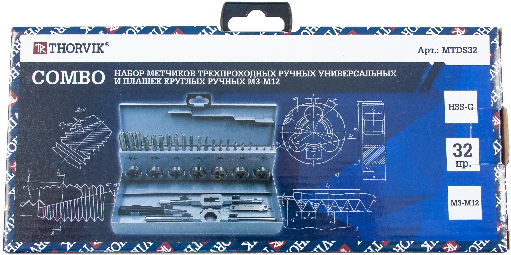 10 цен на Набор метчиков и плашек М3-М12, HSS-G, 32 предмета, трехпроходные универсальные серия COMBO MTDS32 Thorvik