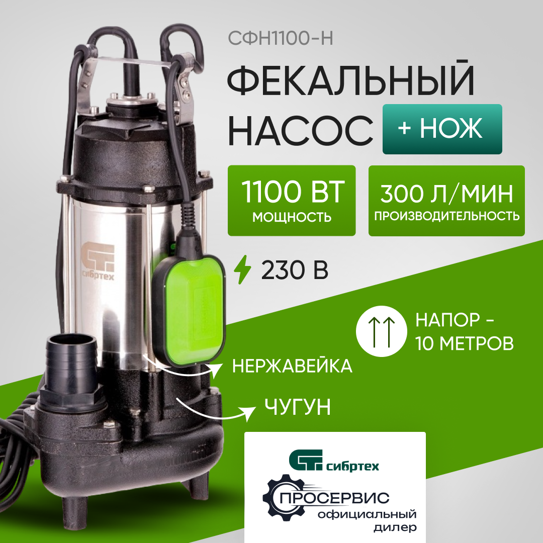 Фекальный насос СФН1100-Н, 1100 Вт, напор 10 м, 18000 л/ч, нож Сибртех Сибртех