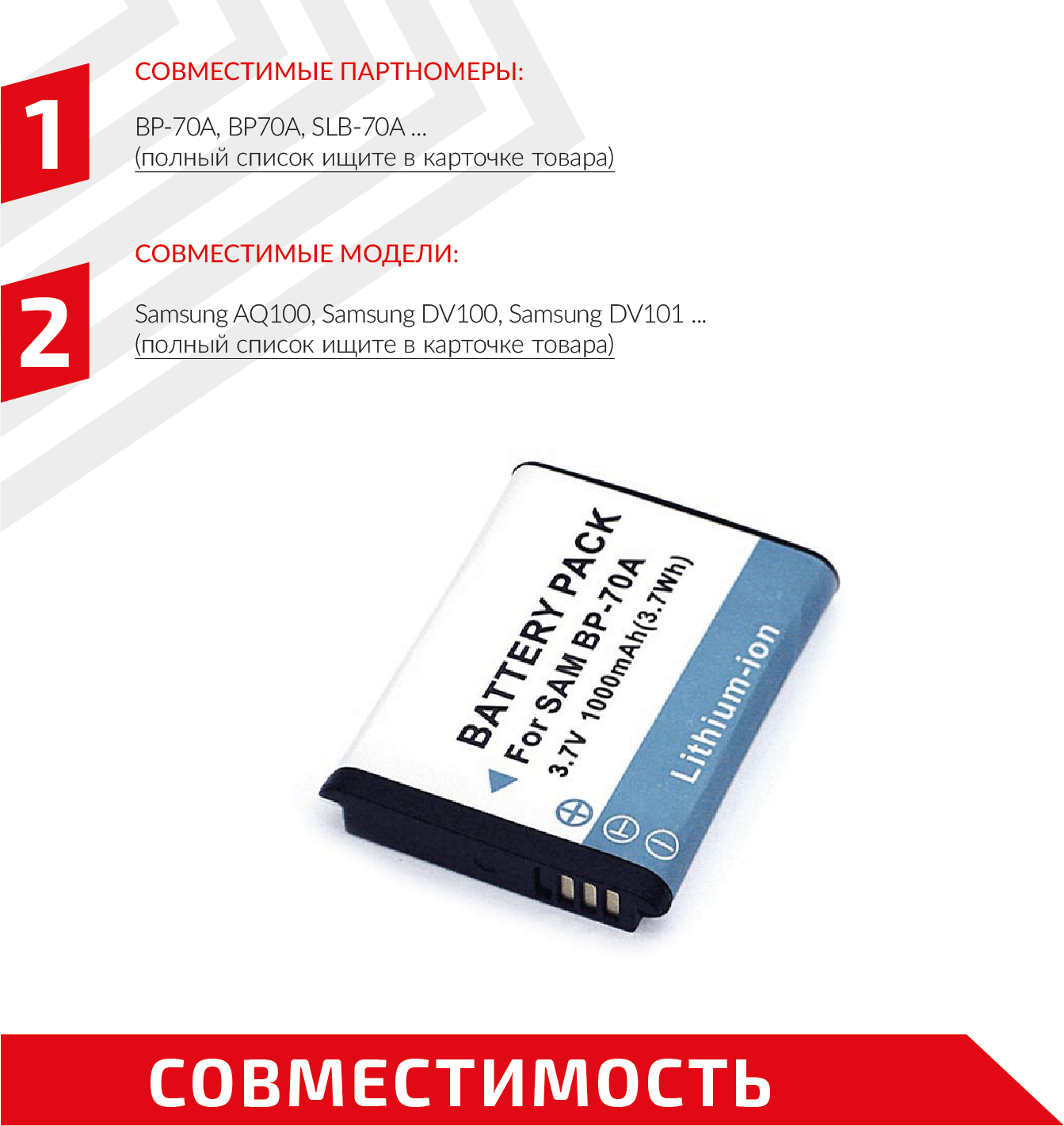 Аккумуляторная батарея для фотоаппарата Samsung Digimax AQ (BP-70A) 3,7V 1800mAh Li-ion информация: