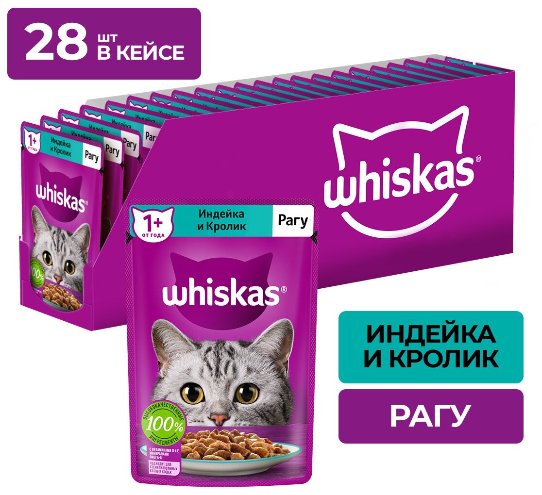Влажный корм Whiskas для взрослых кошек, рагу с индейкой и кроликом, 75 г х 28 шт информация: