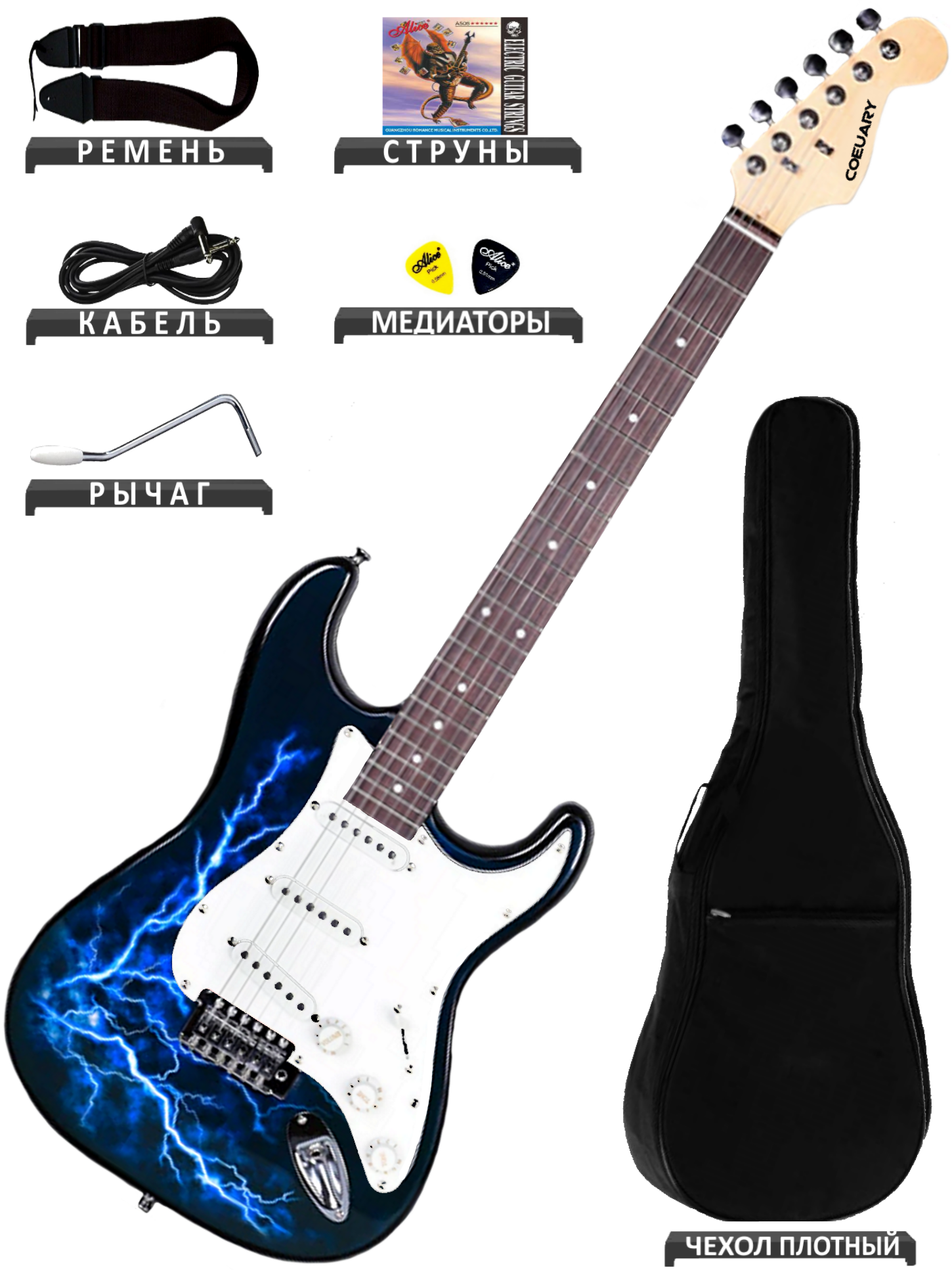 Электрогитара с набором Coeuary Комплект (плюс чехол, ремень, шнур, струны, медиаторы, рычаг тремоло, ключи!) информация: