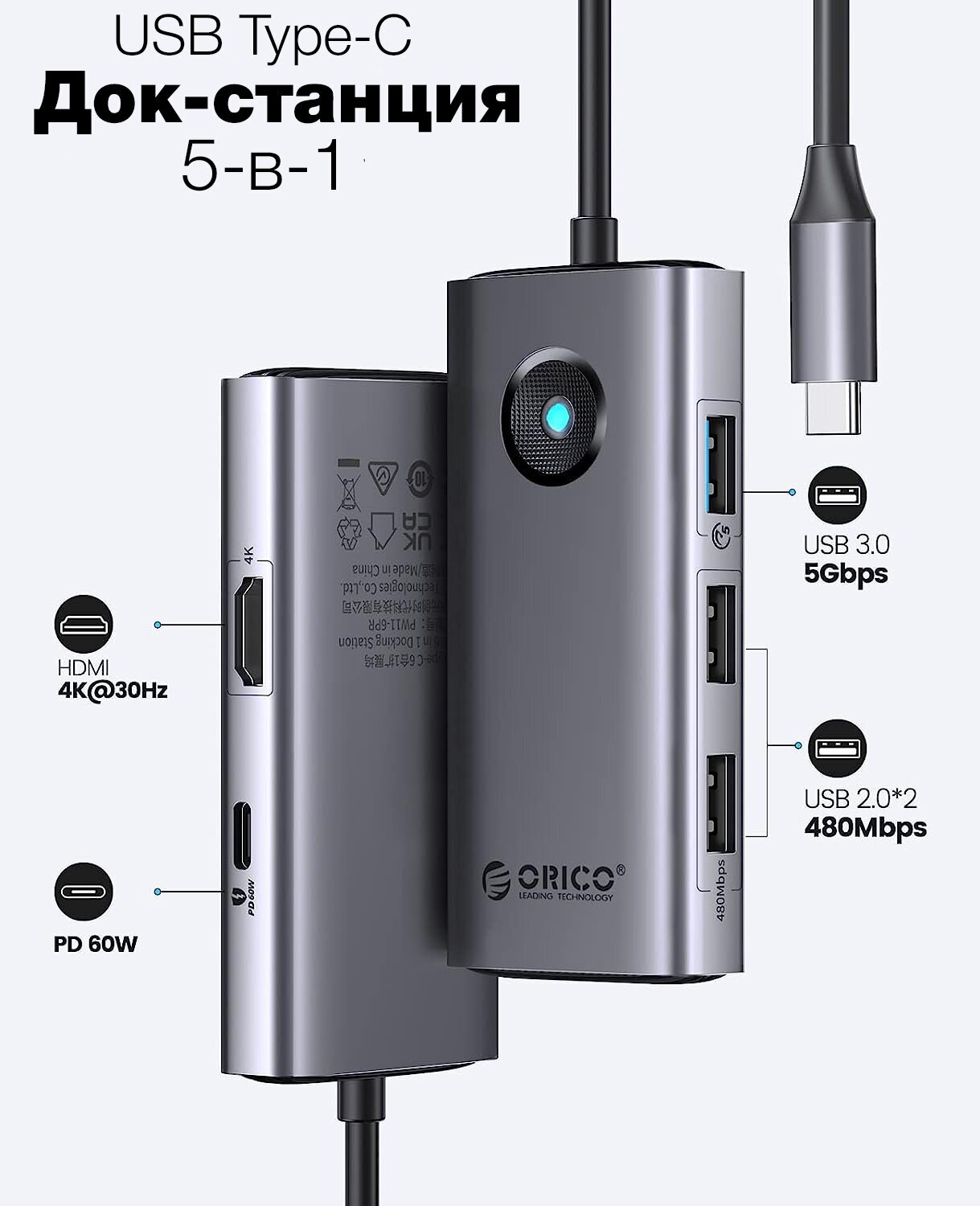 Многопортовый переходник 5 в 1 Orico Docking Station F-Eyes Space Gray (HDMI, USB 3.0, USB 2.0, PD 60W) информация: