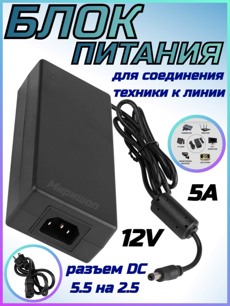 Блок питания (12V, 5A, разьем DC - 5.5 на 2.5) информация: