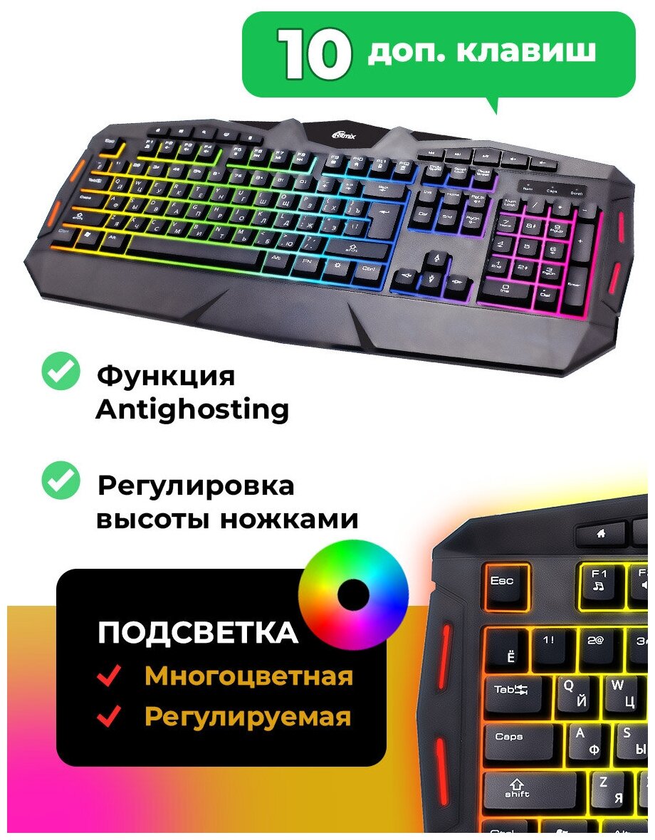 Клавиатура игровая RITMIX RKB-555BL, корп:пласт,Подсв:настр.реж.ярк,Подкл:проводUSB,ткан опл каб,клав:104,мульти:10