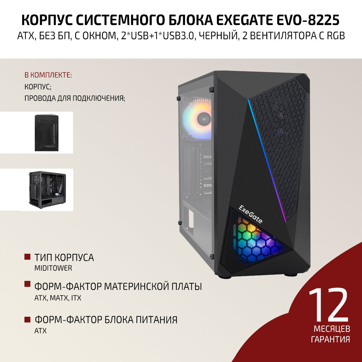 Корпус системного блока EXEGATE Miditower EVO-8225 (ATX, без БП, 2*USB+1*USB3.0, черный, 2 вент. с RGB подсветкой и полоса на передней панел информация: