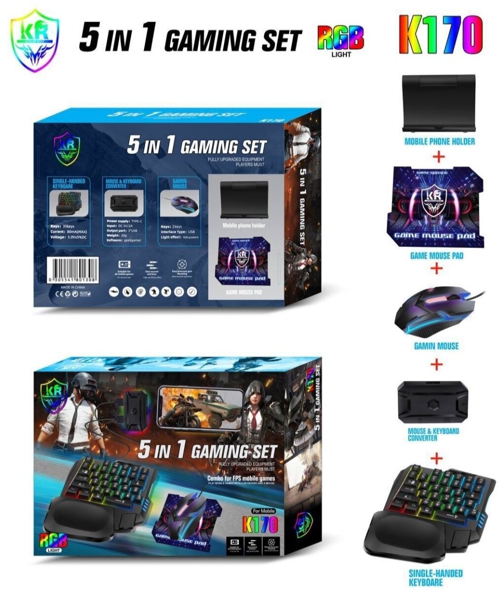 Набор геймера к телефону. Игровой набор для телефона 5 в 1. Игровая клавиатура + мышь для игры .Combo for FPS mobile games/RGB подсветка. К170 информация:
