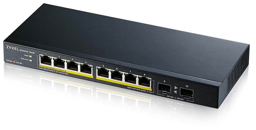 10 цен на Коммутатор PoE+ Zyxel GS1100-10HP, 8xGE PoE+, 2xSFP, настольный, бесшумный, бюджет PoE 130 Вт, Kensigton lock
