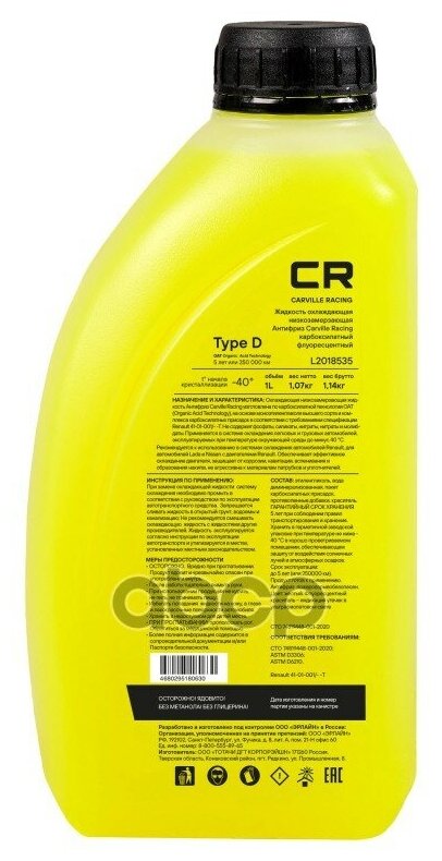 Антифриз CR для а м Renault (Лада Nissan) Type D флуор. -40°С желтый готовый 1л 1.07кг Carville Racing L2018535 информация: