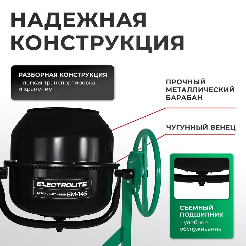 Бетоносмеситель бытовой строительный / Электробетономешалка принудительного действия / Гравитационная бетономешалка электрическая для дома и дачи Electrolite БМ-145 ( 650 Вт, 145 л, чугунный венец) информация: