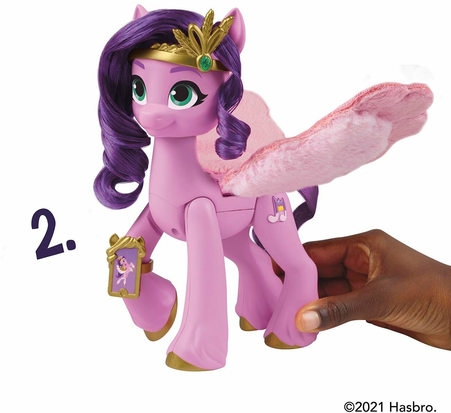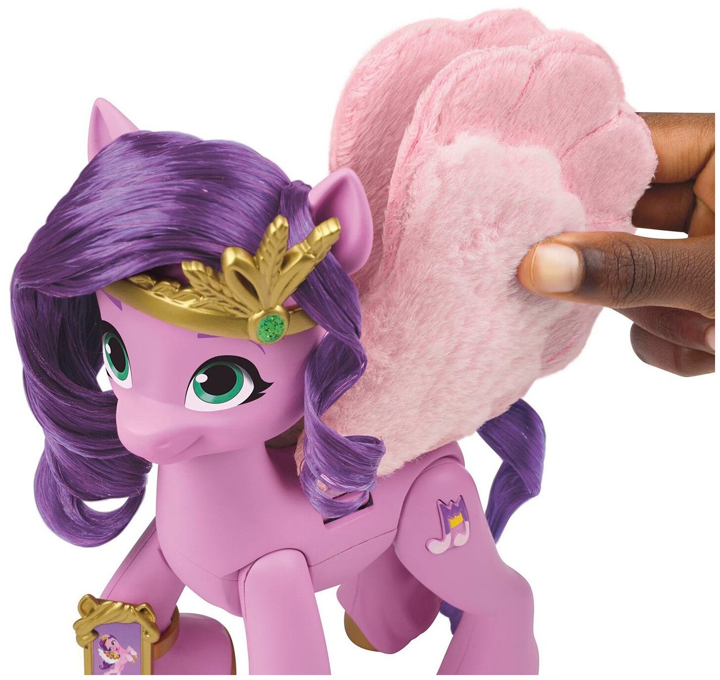 | Дополнительная информация | фигурка Принцессы Петалс имеет фиолетовые волосы и знак отличия в виде ноты, нажав на который, можно услышать песню из мультфильма «My Little Pony: Новое поколение»; чтобы пони взмахнула пушистыми крыльями, сожмите задние ноги фигурки вместе; песня звучит только на английском языке, для работы требуется 1 батарейка типа ААА |