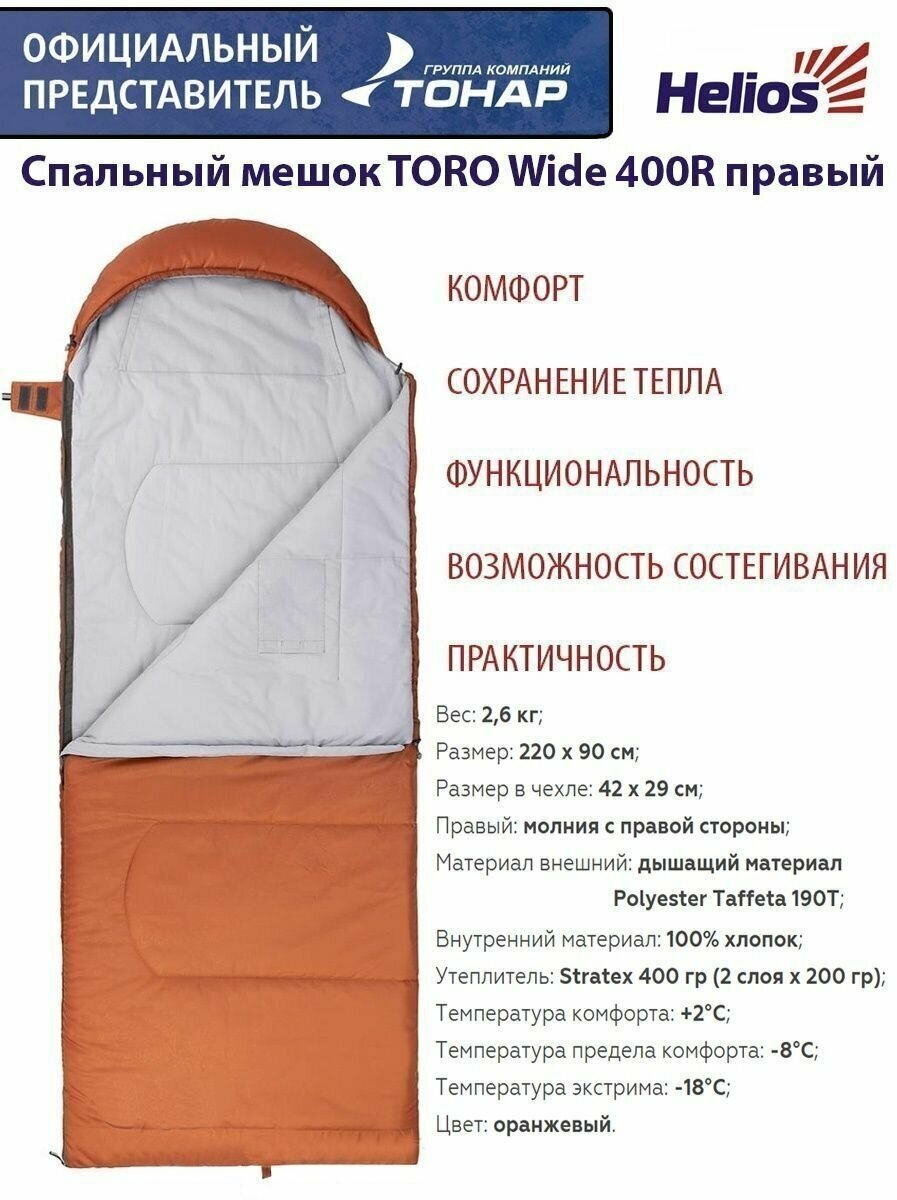 Спальный мешок TORO Wide 400R правый Helios информация: