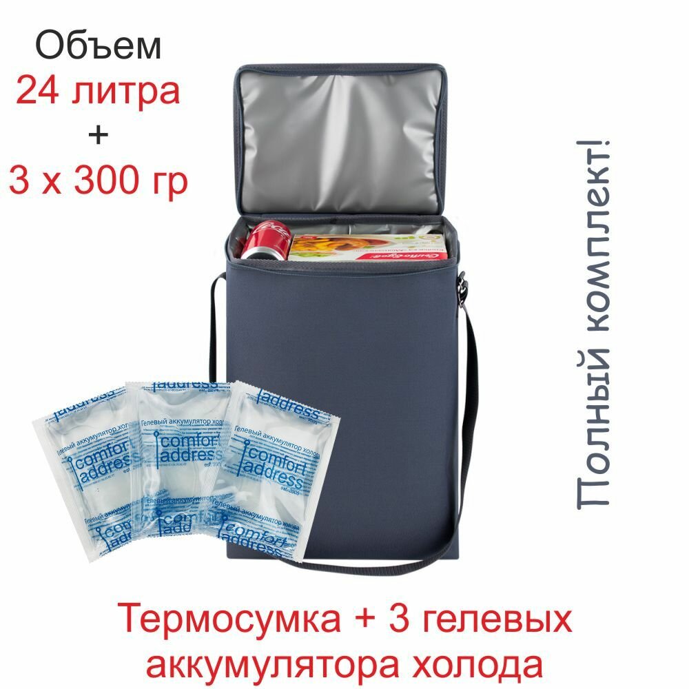 Сумка-холодильник 24л. + 3 гелевых аккумулятора холода по 300 гр. "Comfort Address" цвет: серый, с плечевым ремнём информация: