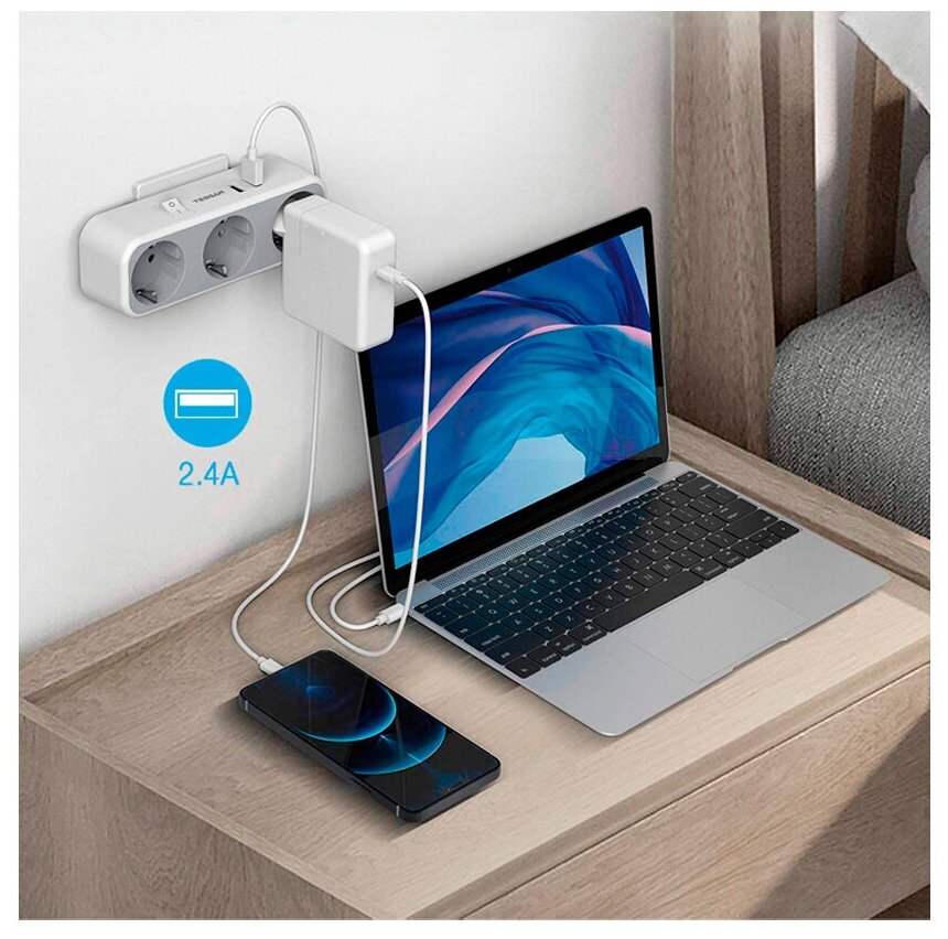 Сетевой фильтр без провода TESSAN TS-301-DE-C 3 розетки 2500 Вт + USB зарядка 2 порта до 3А + 1порт USB-C серый